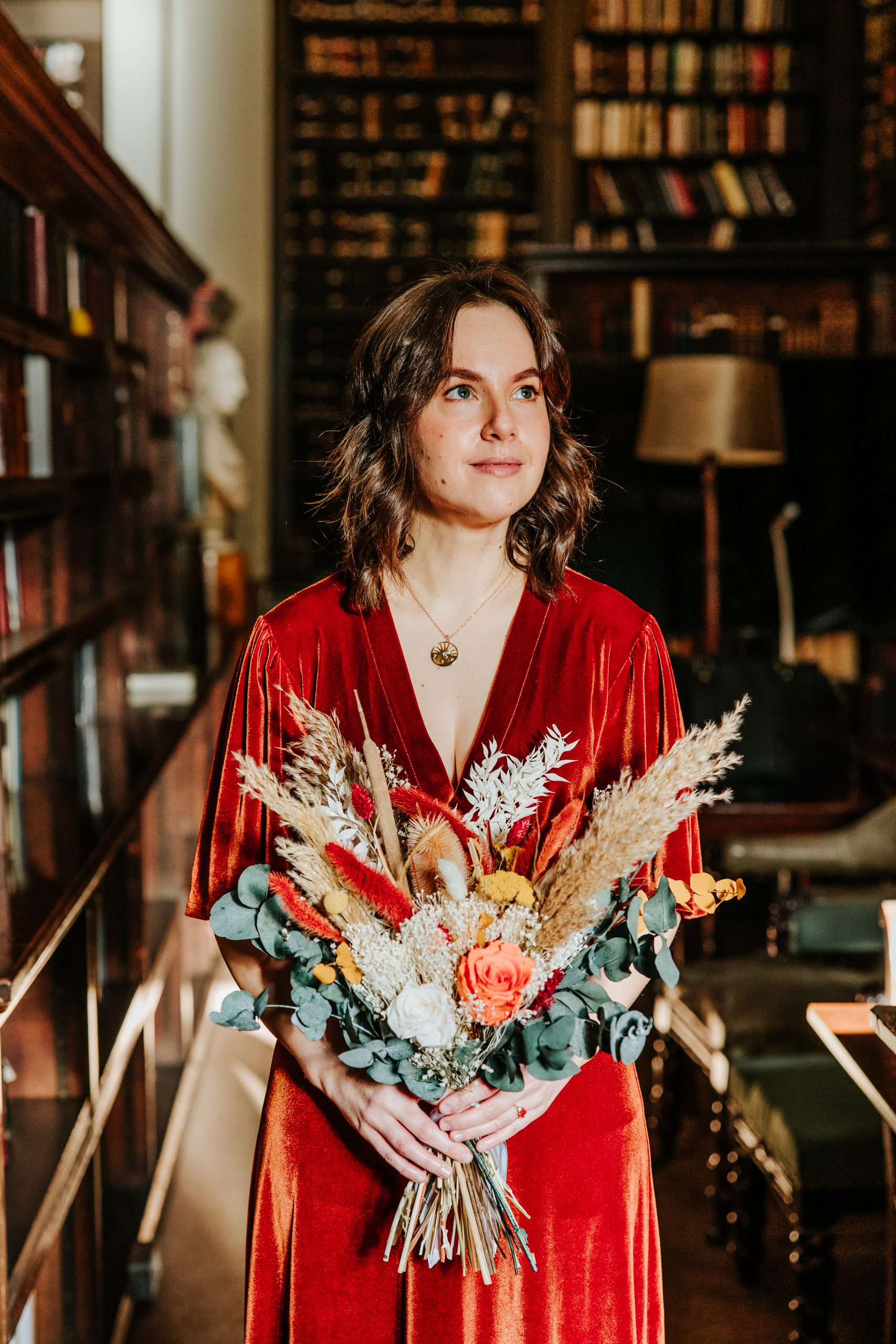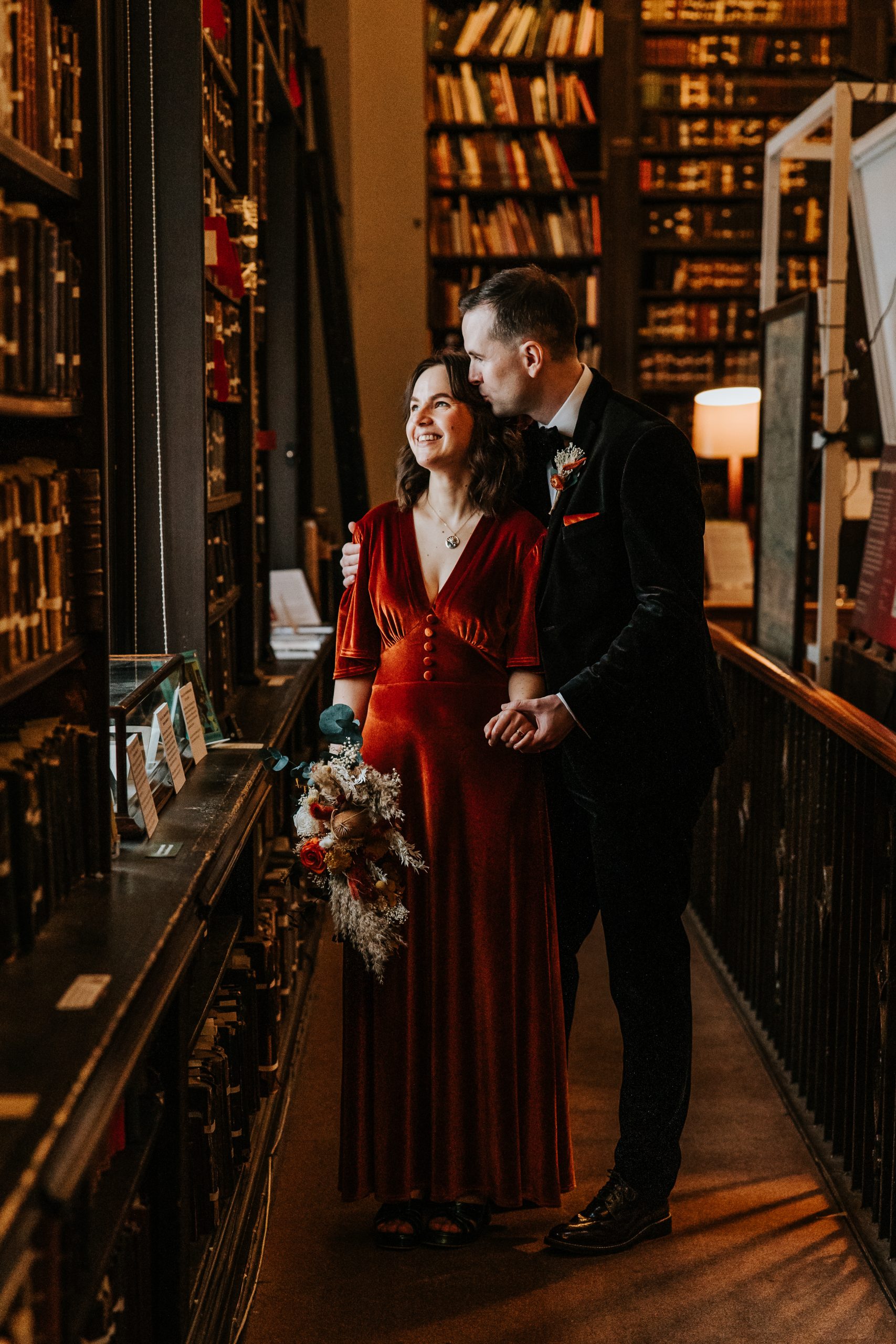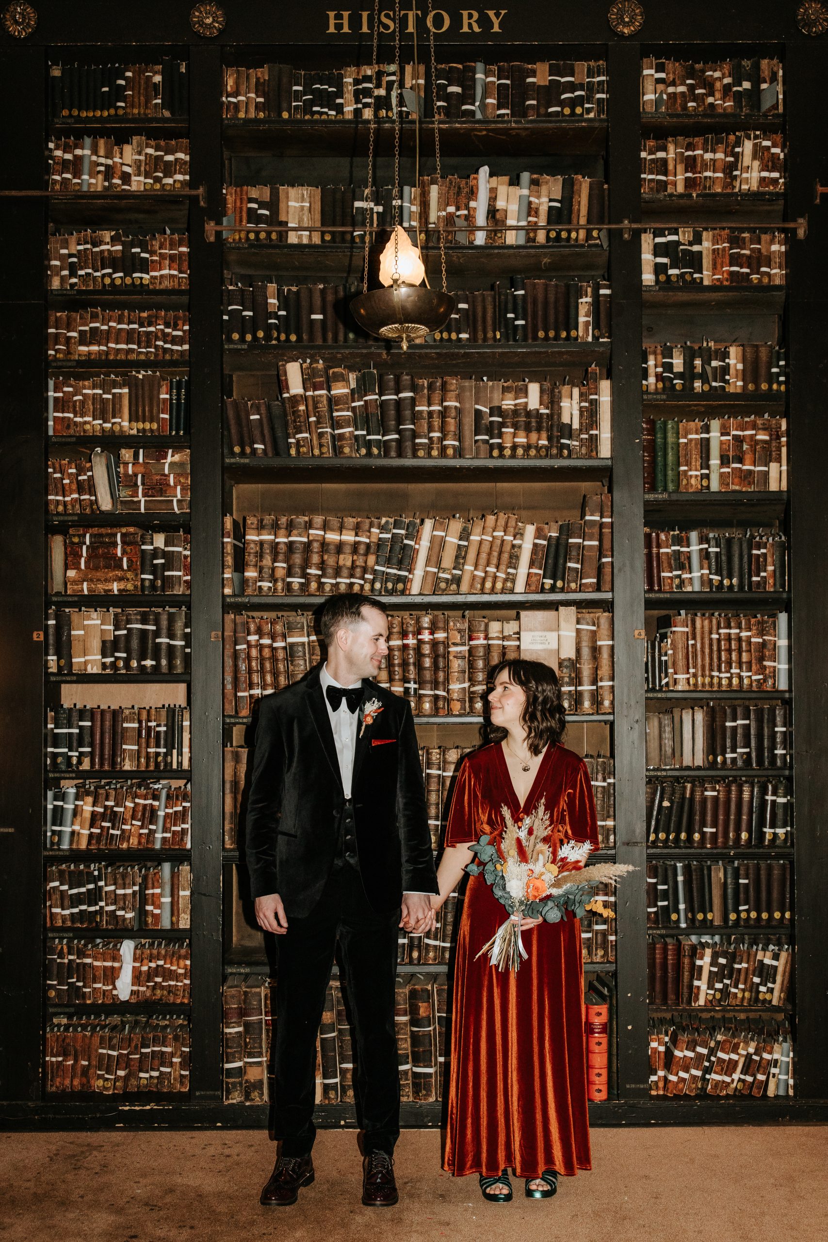 The thing I love most about The Portico Library Manchester wedding experience is the private study at the back of the library. It’s filled with ceiling-high bookshelves and antique furniture. If you’re a bit of a book geek, you’ll be in heaven. It makes such a quirky backdrop for photographs. In the main part of the library, where wedding ceremonies take place, there’s also a stunning stained-glass domed ceiling. The whole venue is packed with history and charm, which makes it feel really special.