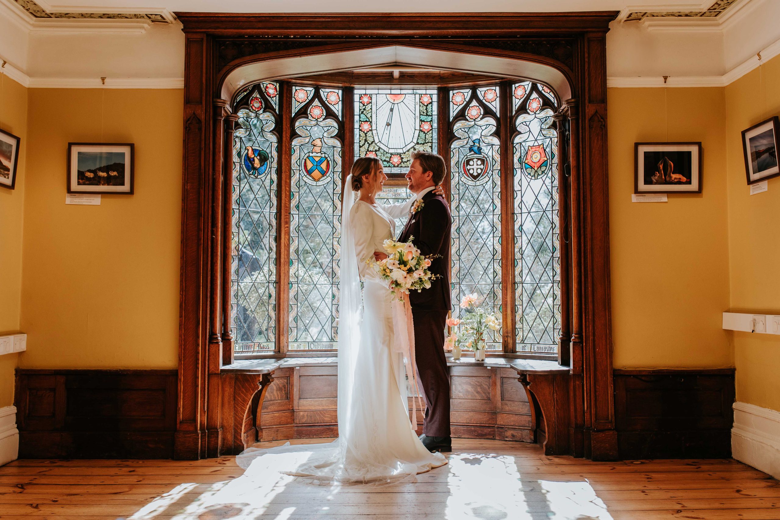 If you’re a foodie, you’ll be happy to hear that Gusto restaurant is right next door and can provide catering for weddings at Elliot House, which makes planning really easy. One of my favourite parts of this venue has to be the beautiful wooden staircase with stained glass windows. It’s such a dreamy spot for couple portraits! If you’re looking for a historic wedding venue in Manchester city centre, I would definitely recommend considering a wedding at Elliot House.