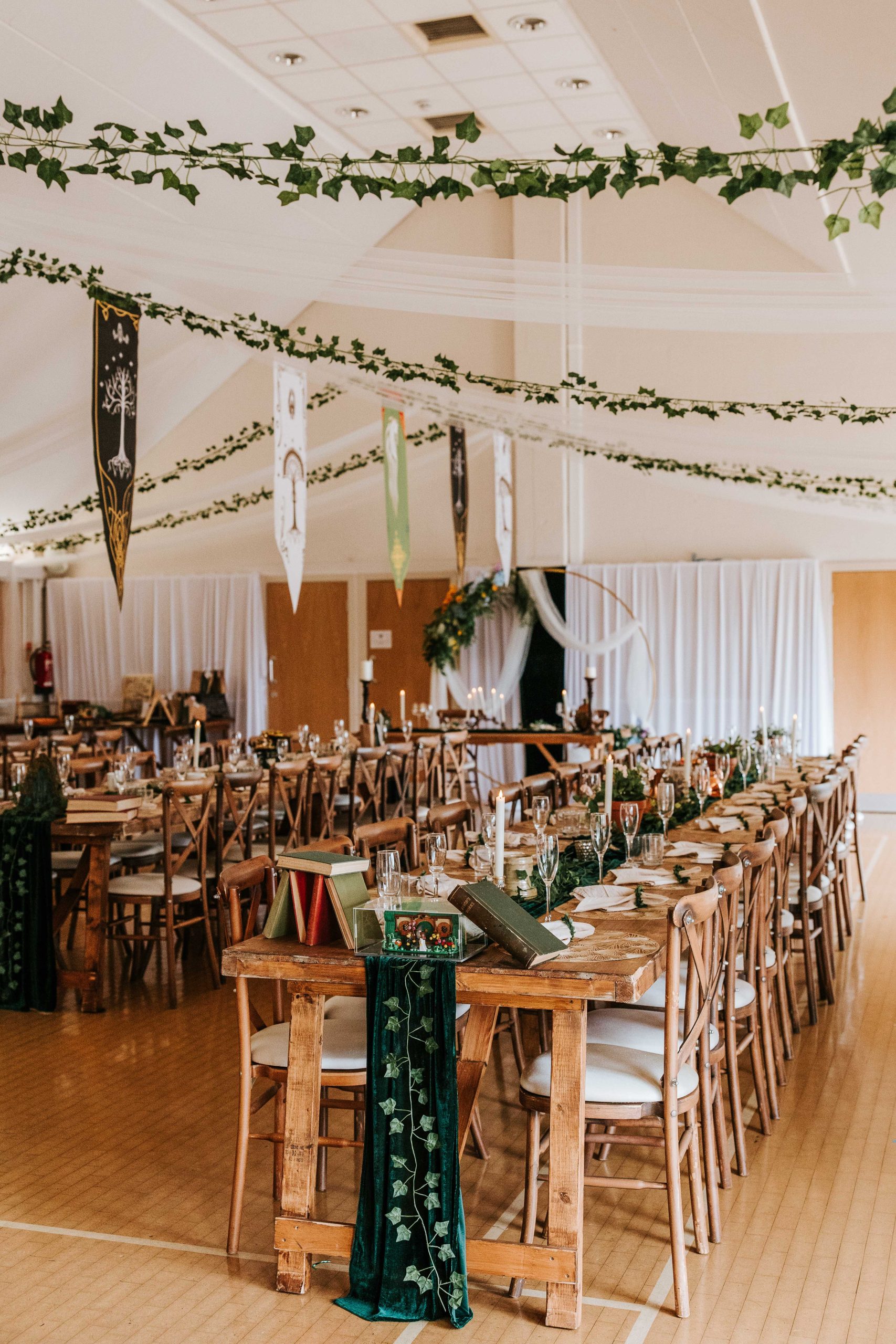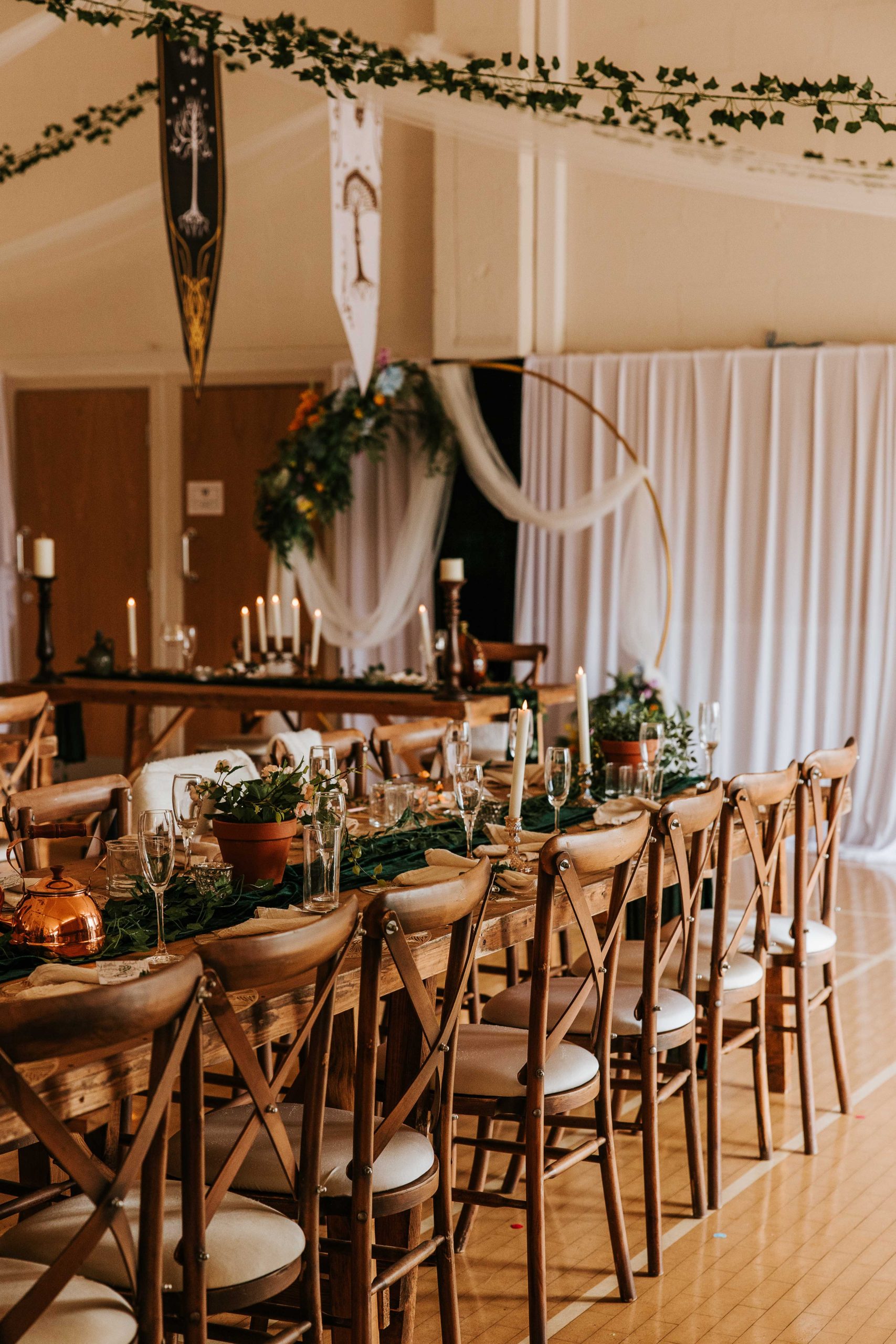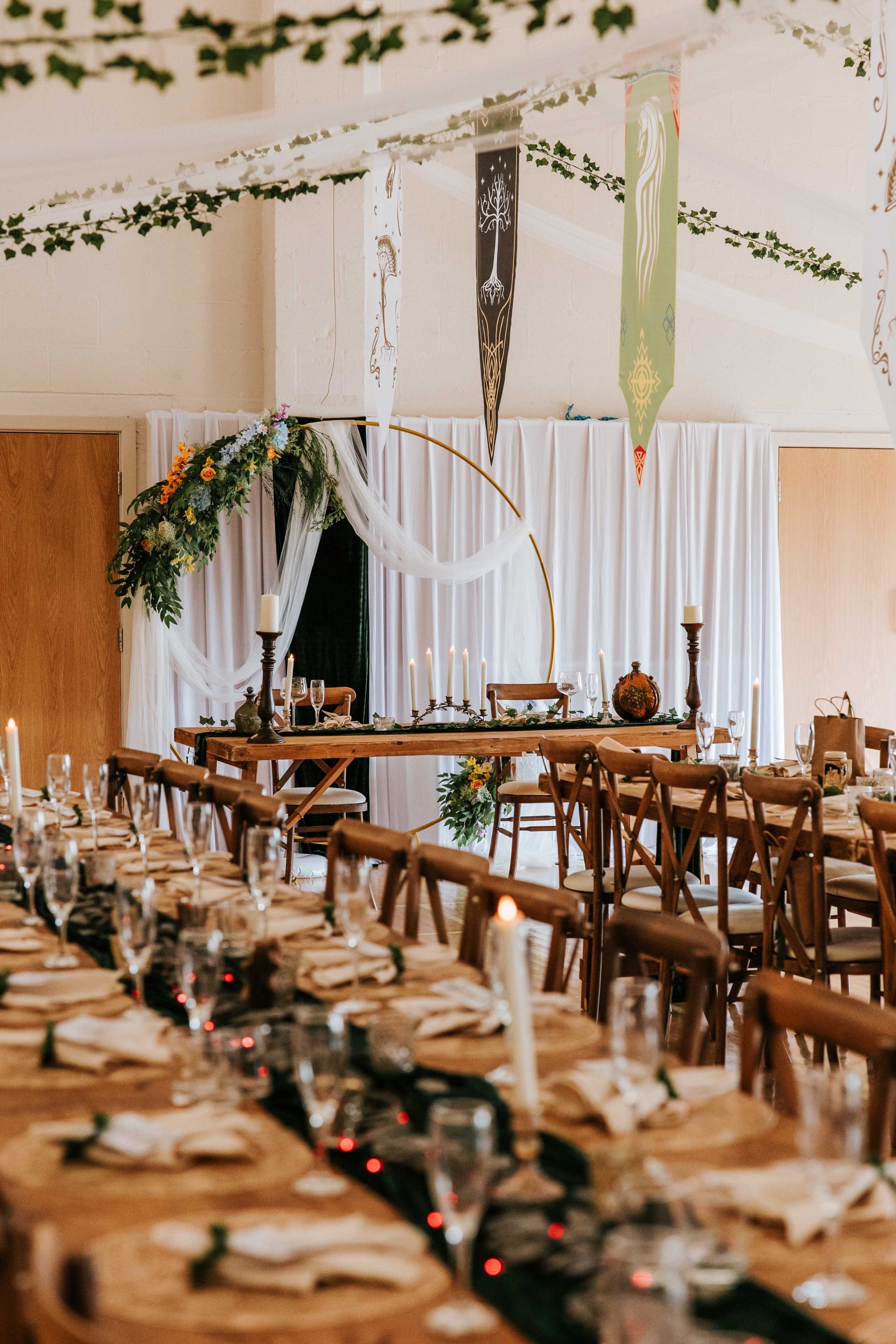 East Keswick Village Hall was the perfect venue for Chloe & Dennis’ wedding. With its outdoor ceremony space and village setting, it genuinely felt like being in Hobbiton. The space lent itself beautifully to their theme and gave them the freedom to completely transform it into their own version of Middle-earth.