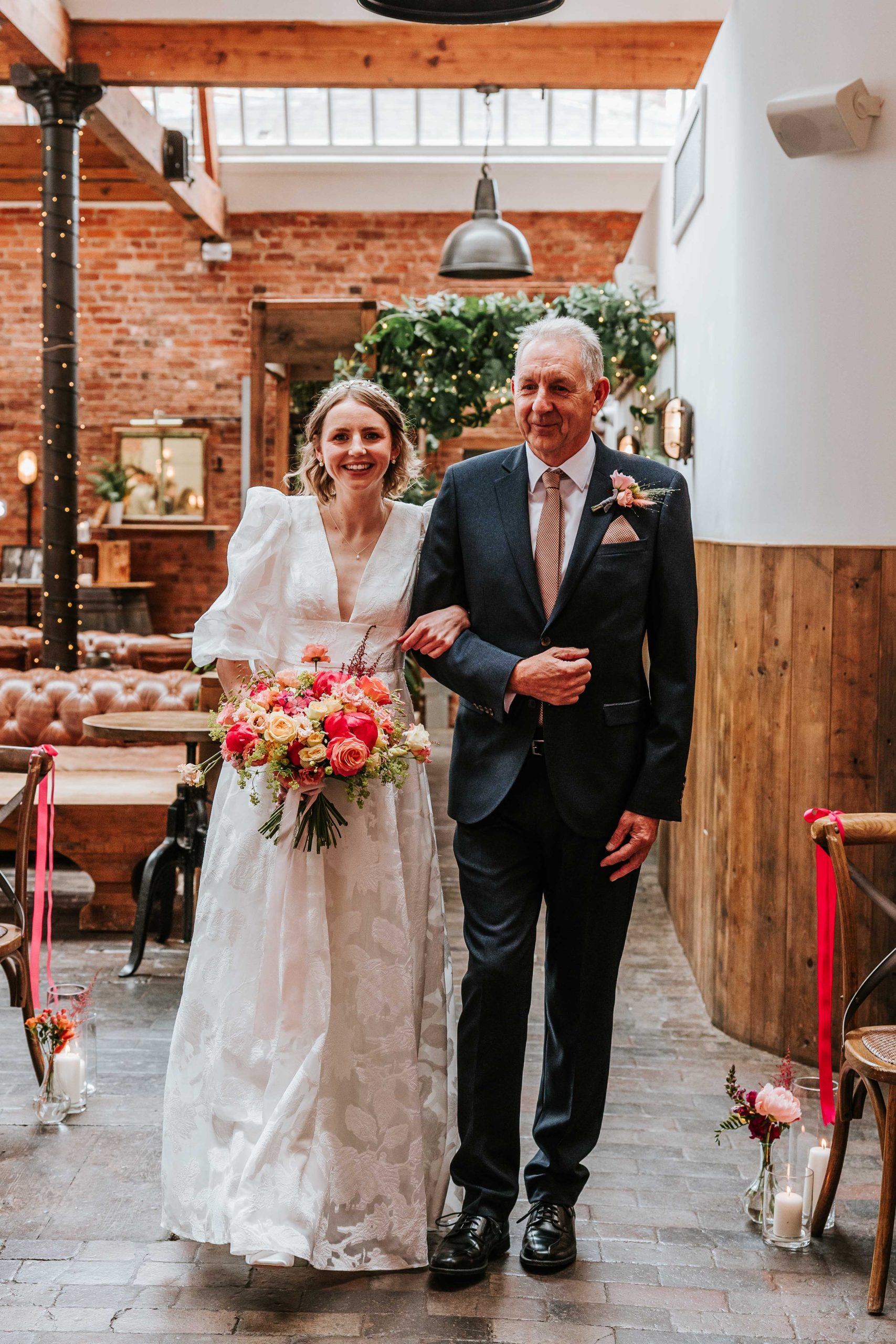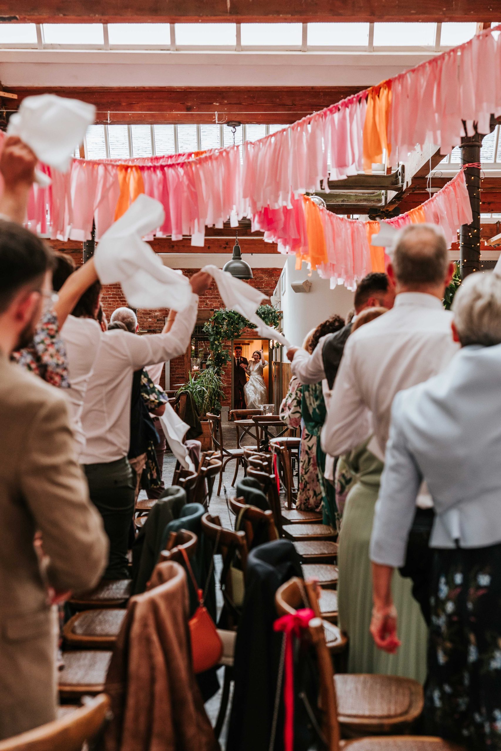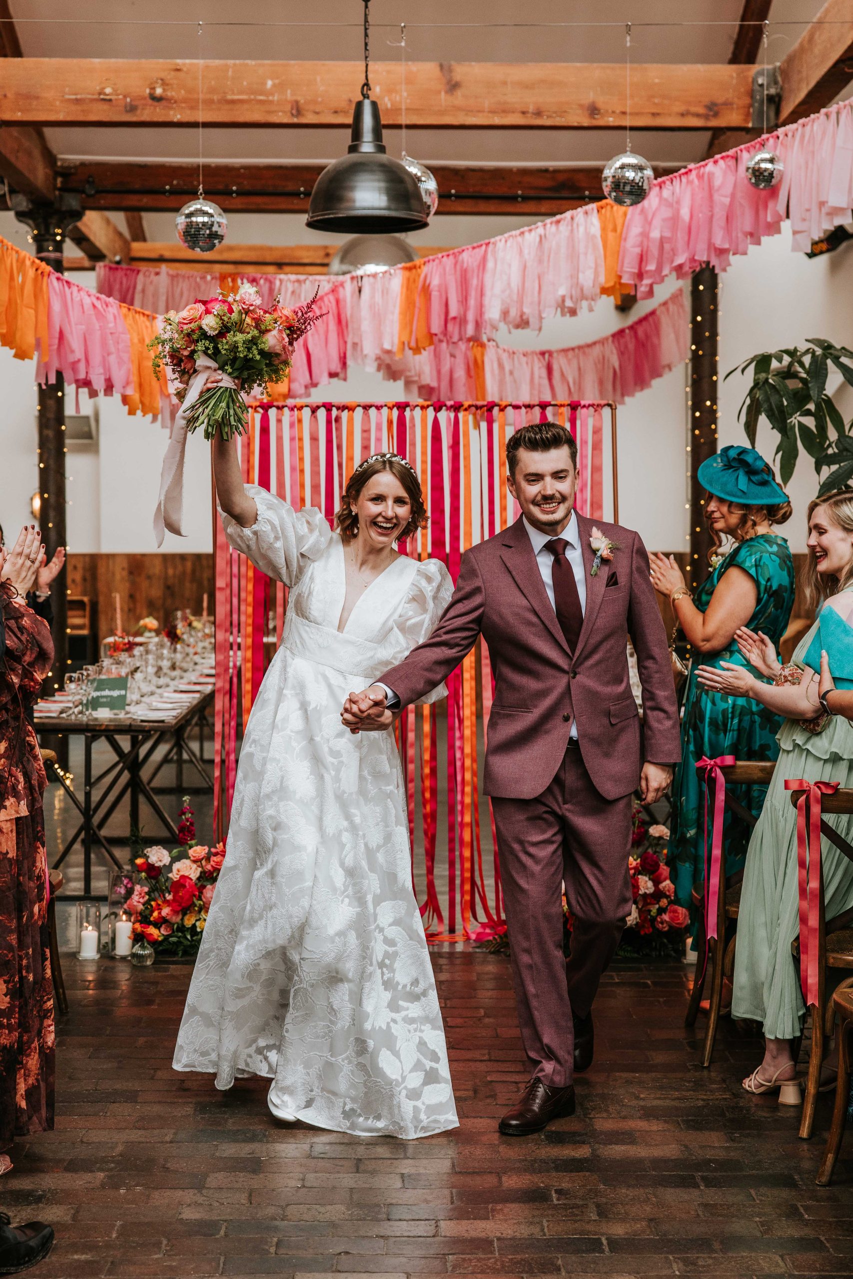 Amy & Sam’s wedding felt like a summer party from start to finish. Their colour palette of pinks and oranges brought so much energy to the day and worked beautifully against the industrial backdrop of the venue.