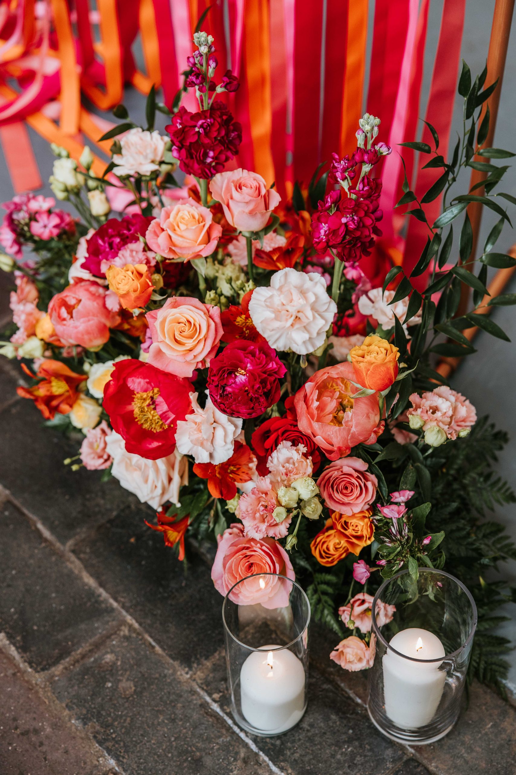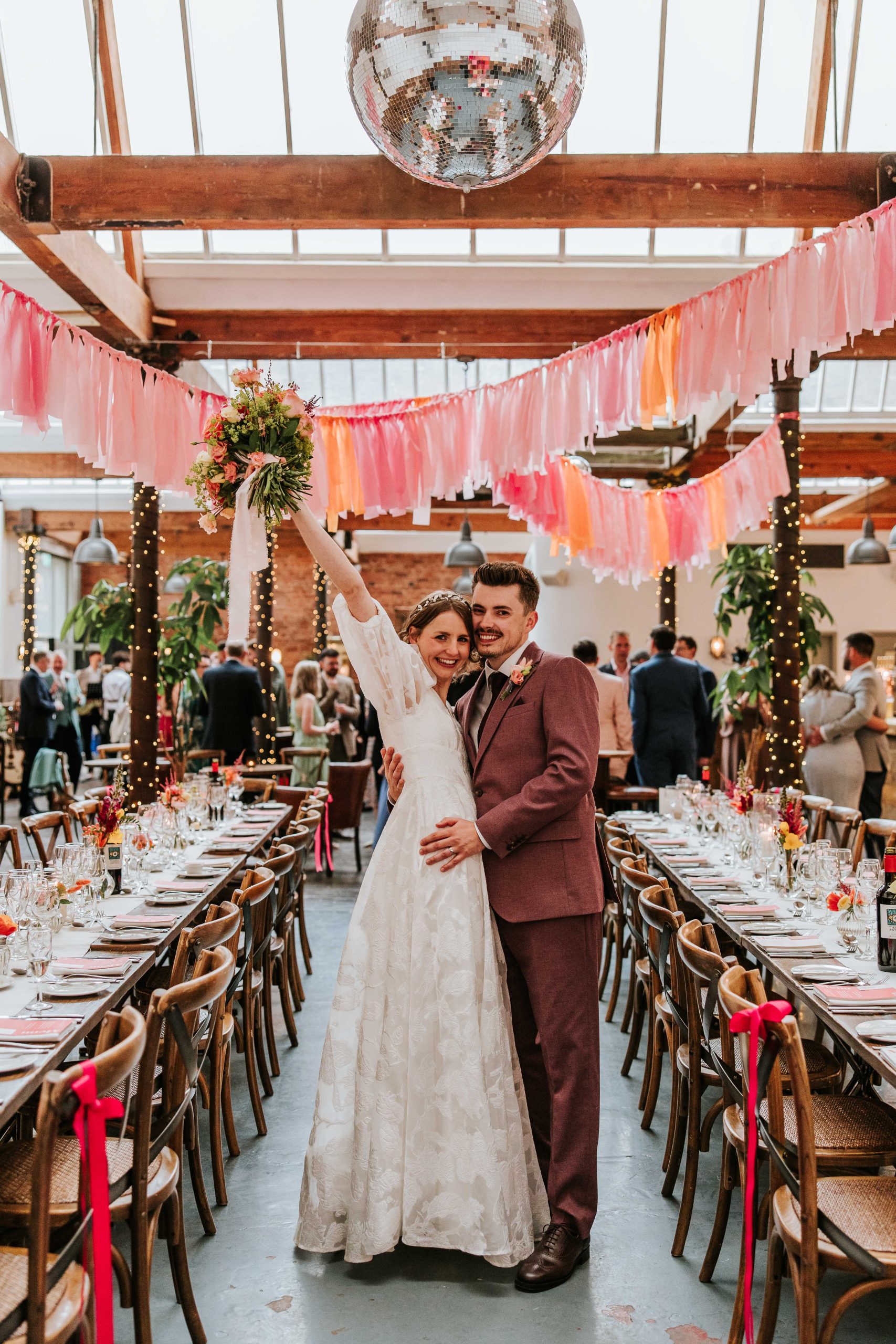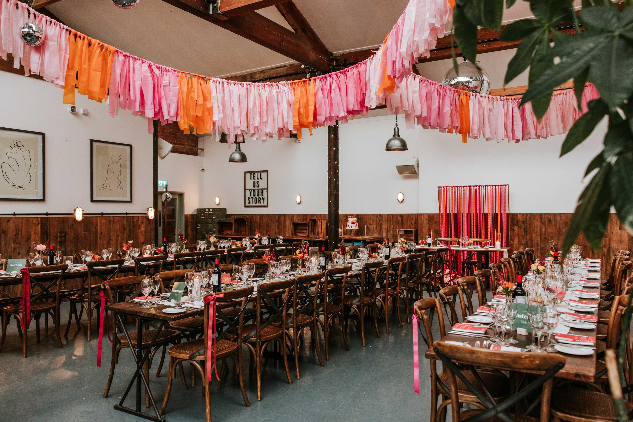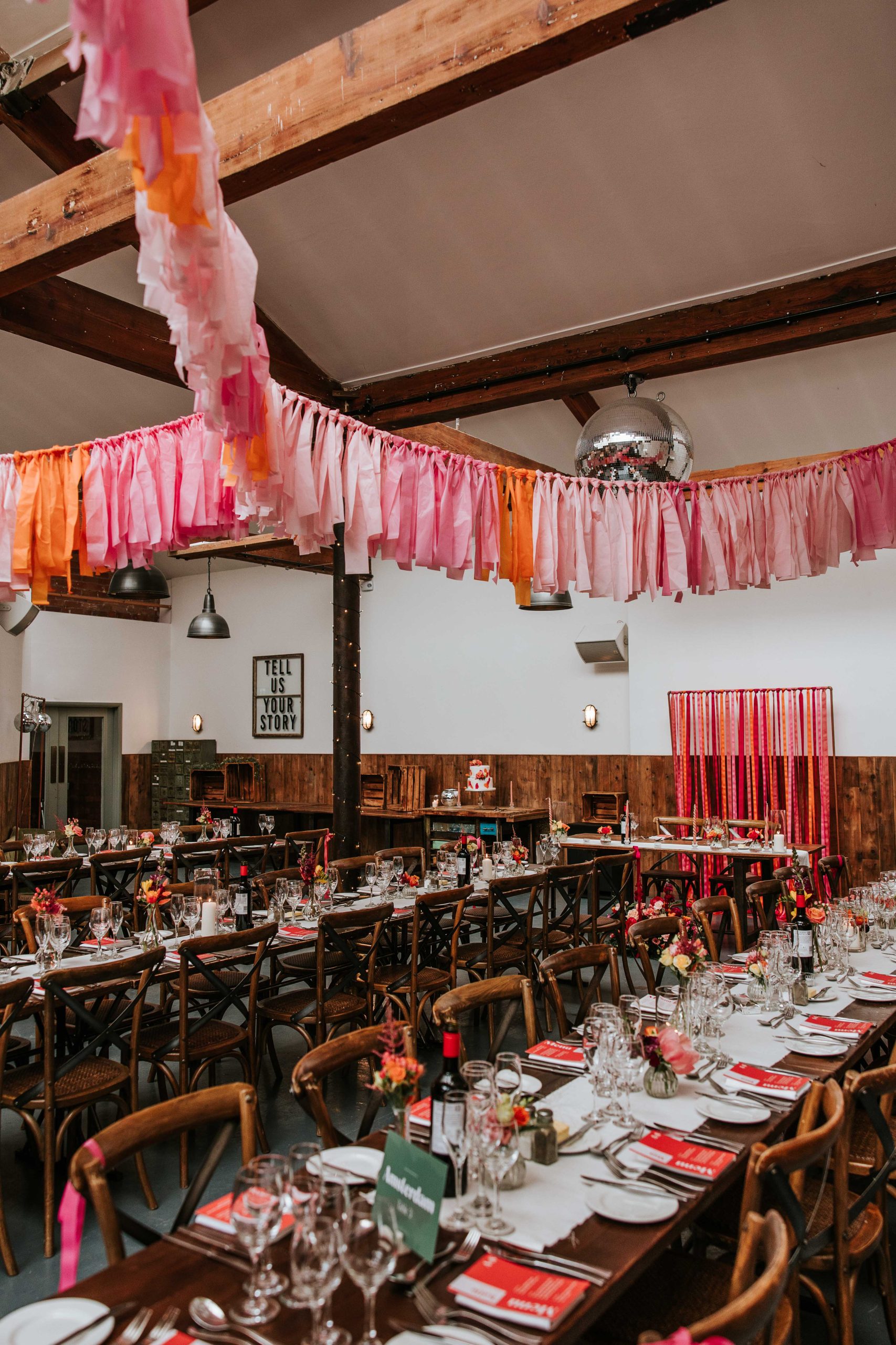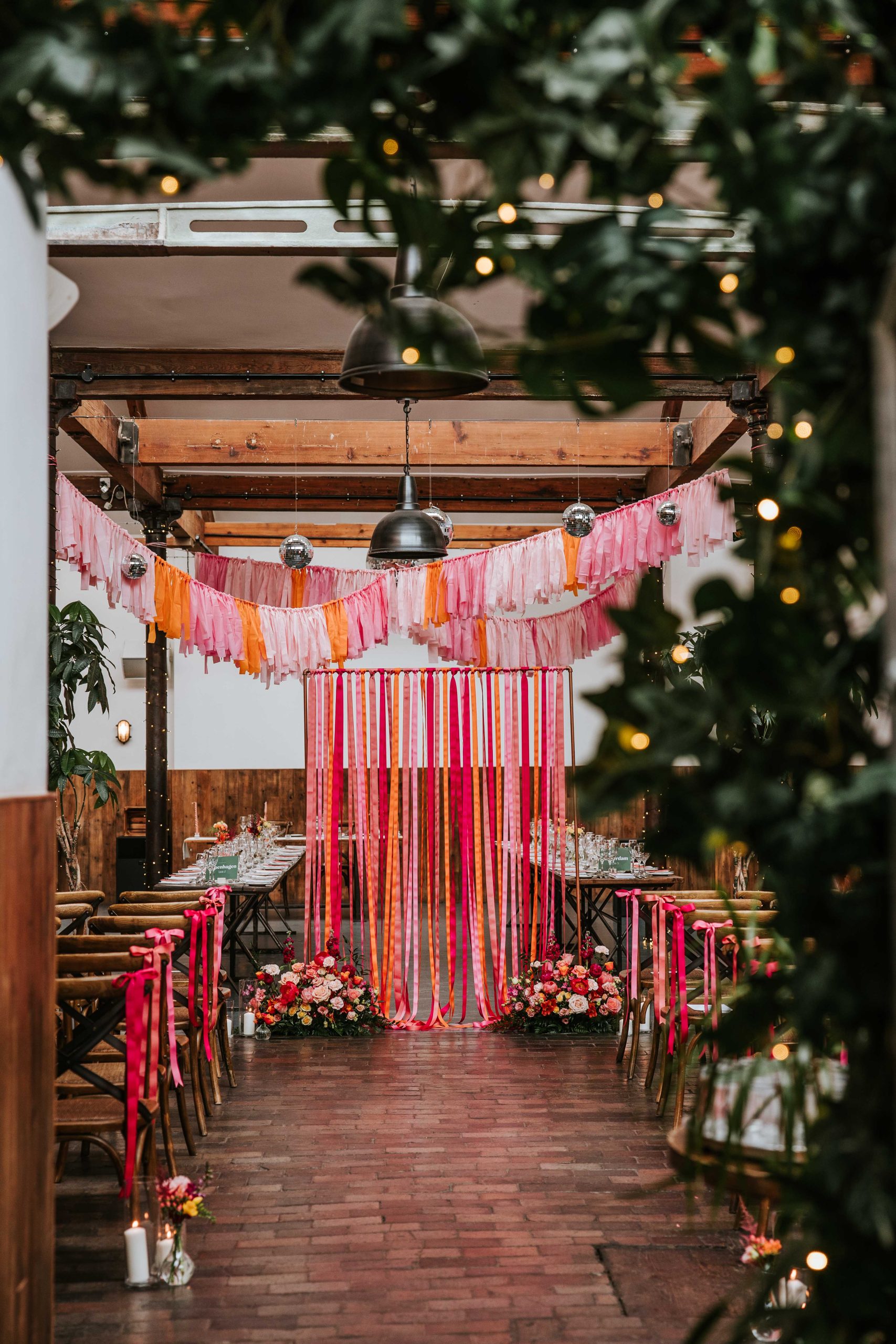 The overall theme of our wedding is a summer party. We’re using bright colours like oranges, pinks, and reds, with ribbons, lots of disco balls, neon signs, and a fun, relaxed vibe throughout the day.